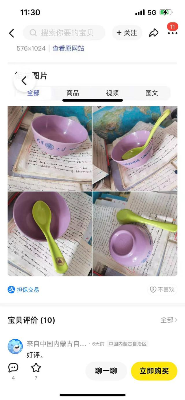 24日,记者调查发现,在相关商品信息中,一套带有“轻微使用痕迹”的紫荆色饭碗与绿色餐勺组合被定价88元。卖家在商品详情图介绍:“清华大学的紫荆色饭碗,买都买不到的,能用它吃饭感觉是不是会不一样。”